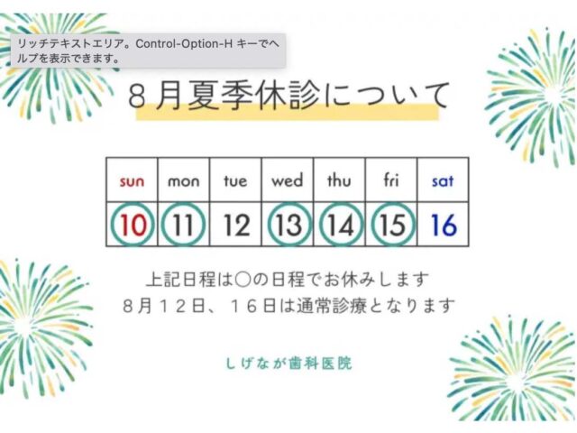 お知らせ2025年 8月夏季休診のお知らせいつもしげなが歯科へご来院いただきありがとうございますしげなが歯科は上記の日程で休診とさせていただきます8月12日(火)、16日(土) は通常通り診療を行っておりますご迷惑をおかけしますがよろ...